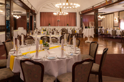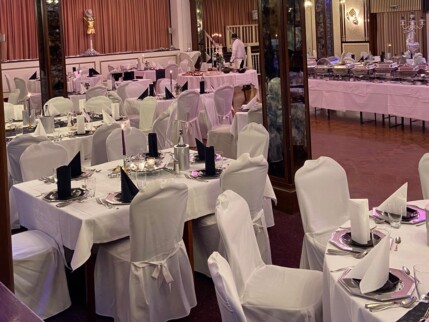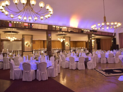 Unser großer Saal bietet Platz für 450 Personen, ist individuell abteilbar und bietet mit der handgemachten runden Kuppel eine wirklich festliche Atmosphäre für Ihren Anlass. Ob an runden Tischen, langen Tischen, mit oder ohne Hussen, mit großer Tafel oder kleinen Tischgruppen – alle Möglichkeiten stehen Ihnen bei uns offen. Modernste LED-Technik lässt den Saal im individuellen Licht erscheinen und lässt sich auch individuell steuern. Unsere große Bühne bietet Platz für Showeinlagen aller Art, Live-Bands, Diskussionsrunden, Vorträge und alles, was Ihnen noch so einfällt.
